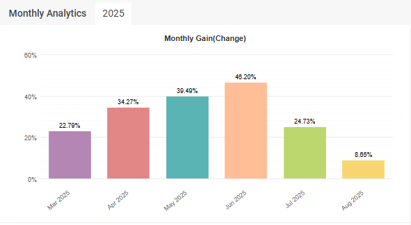The month of June 2025 remained the best one with 46% gain while it has been making more than 24% every month, while it has made about 8% in just 10 days in august.